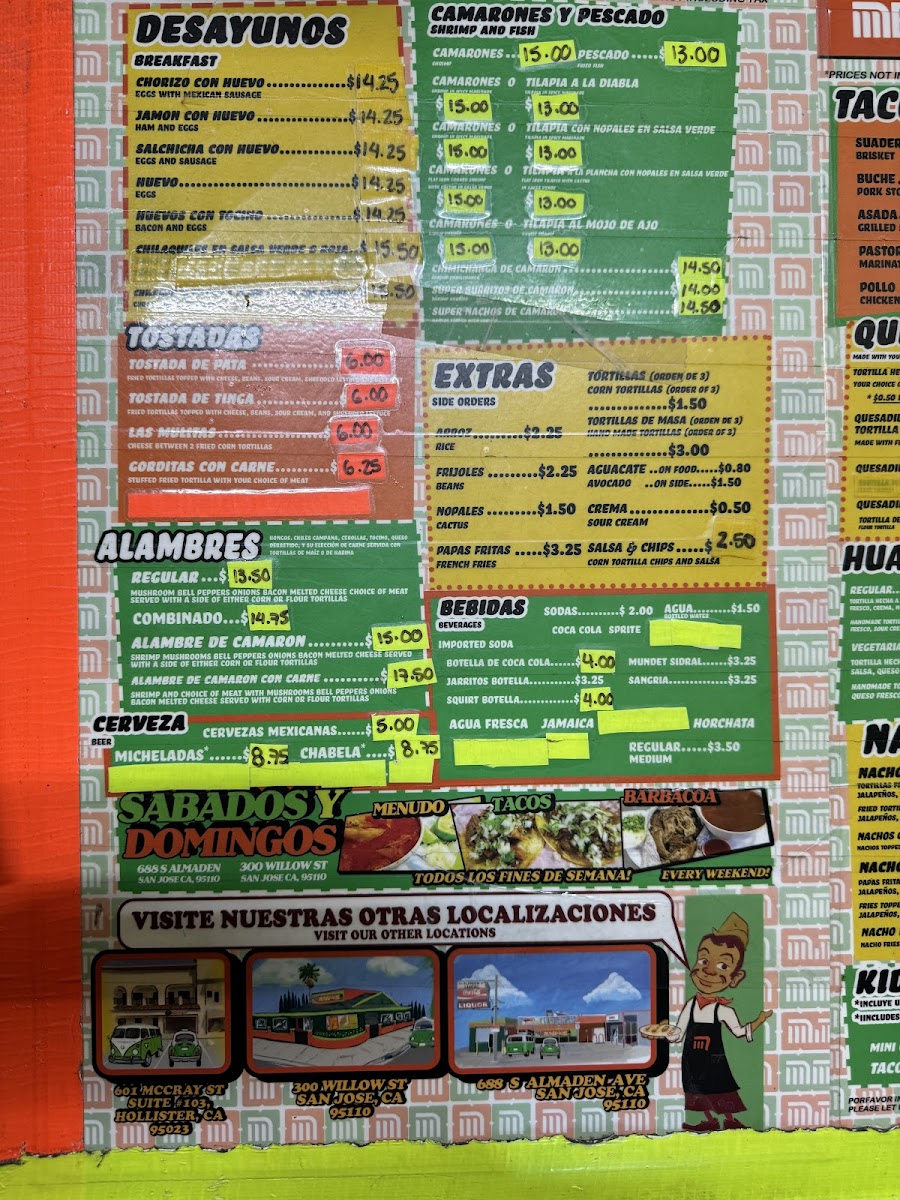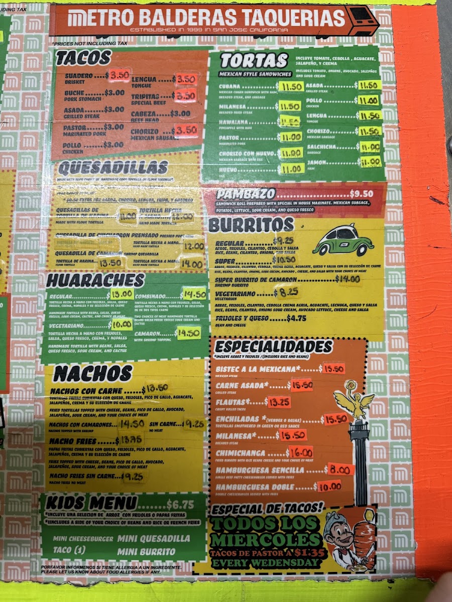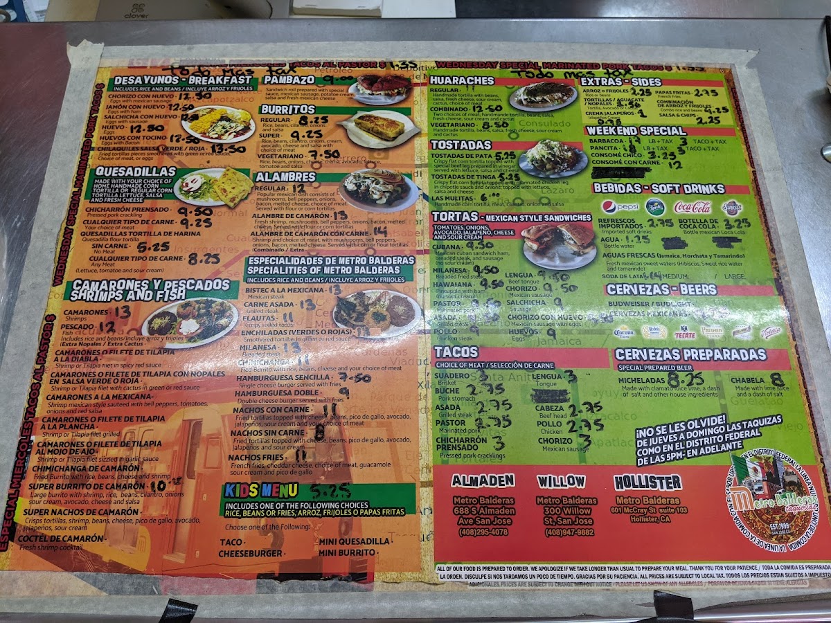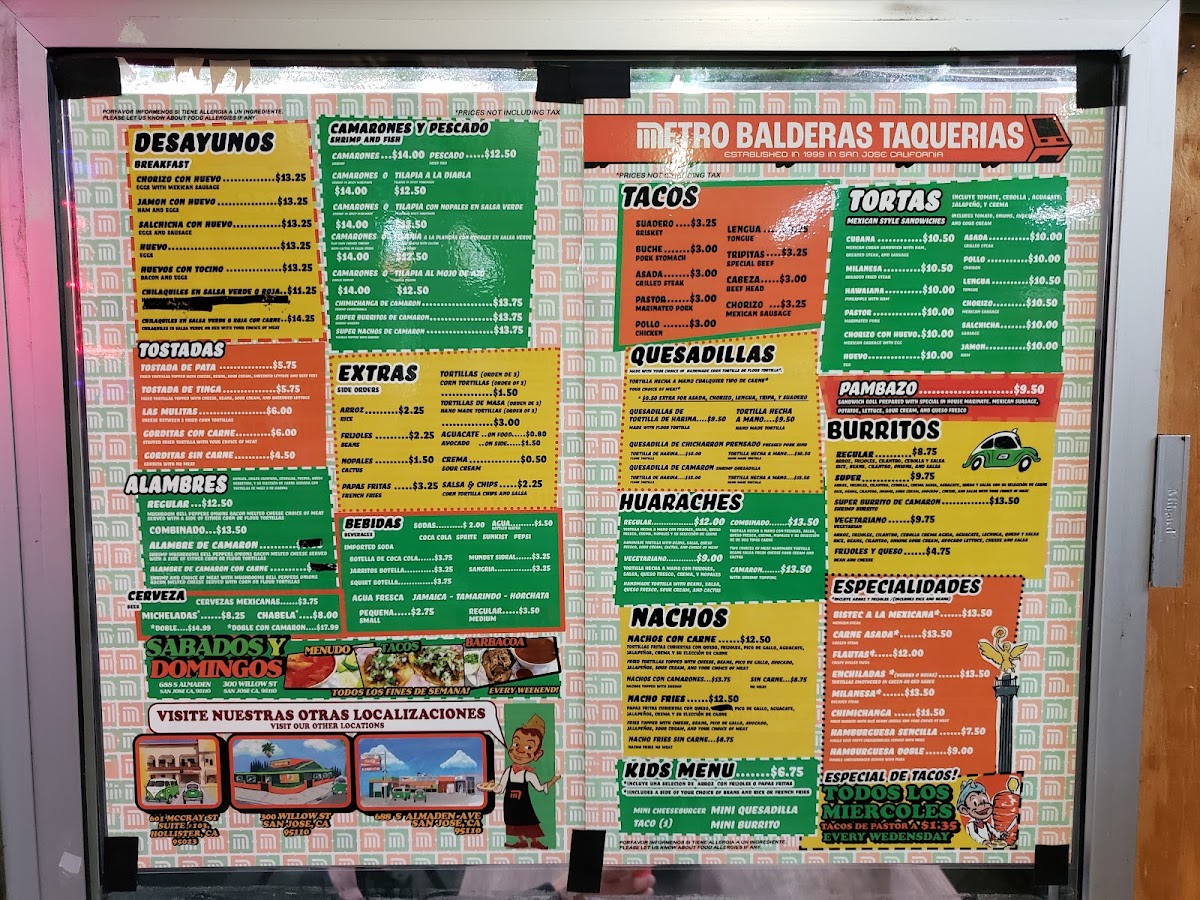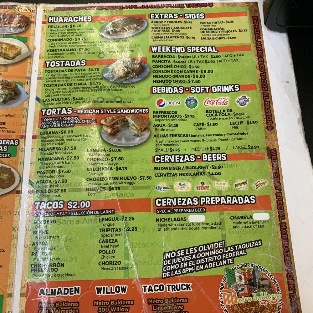 The menu at Metro Balderas 1 offers a variety of traditional Mexican dishes with a focus on tacos and other popular regional specialties. The selection is organized into several categories including tortas, alambres, quesadillas, burritos, and tostadas.